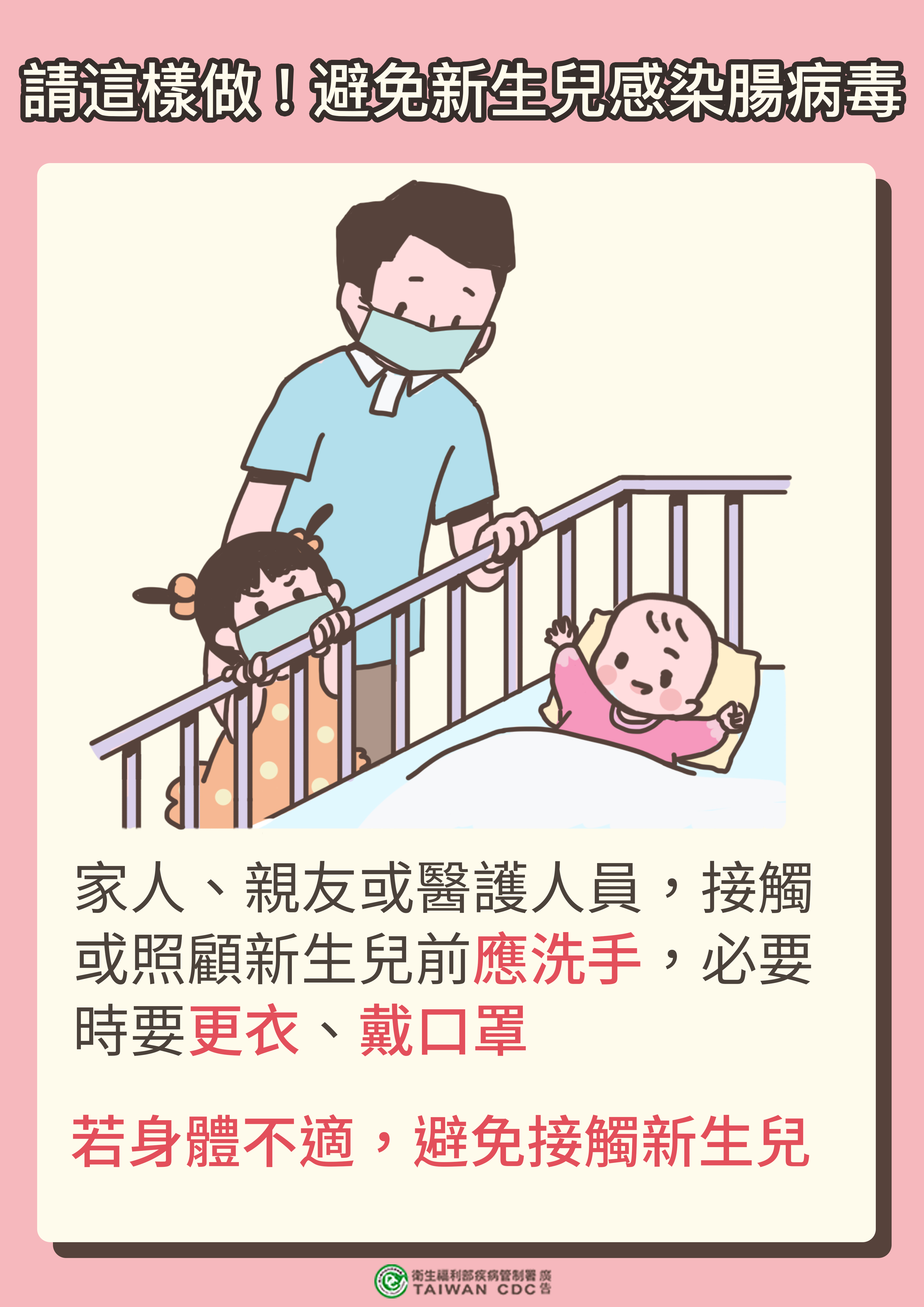疾管署提醒,準媽媽們懷孕期間應注意個人手部及呼吸道衛生,如有發燒、咳嗽、喉嚨痛、腹瀉、肋肌痛等症狀,應主動告知醫師。家中如有成人或幼兒等接觸者,如有身體不適,應避免接觸新生兒。相關資訊可至疾管署全球資訊網(https://www.cdc.gov.tw),或撥打免付費防疫專線1922(或0800-001922)洽詢。