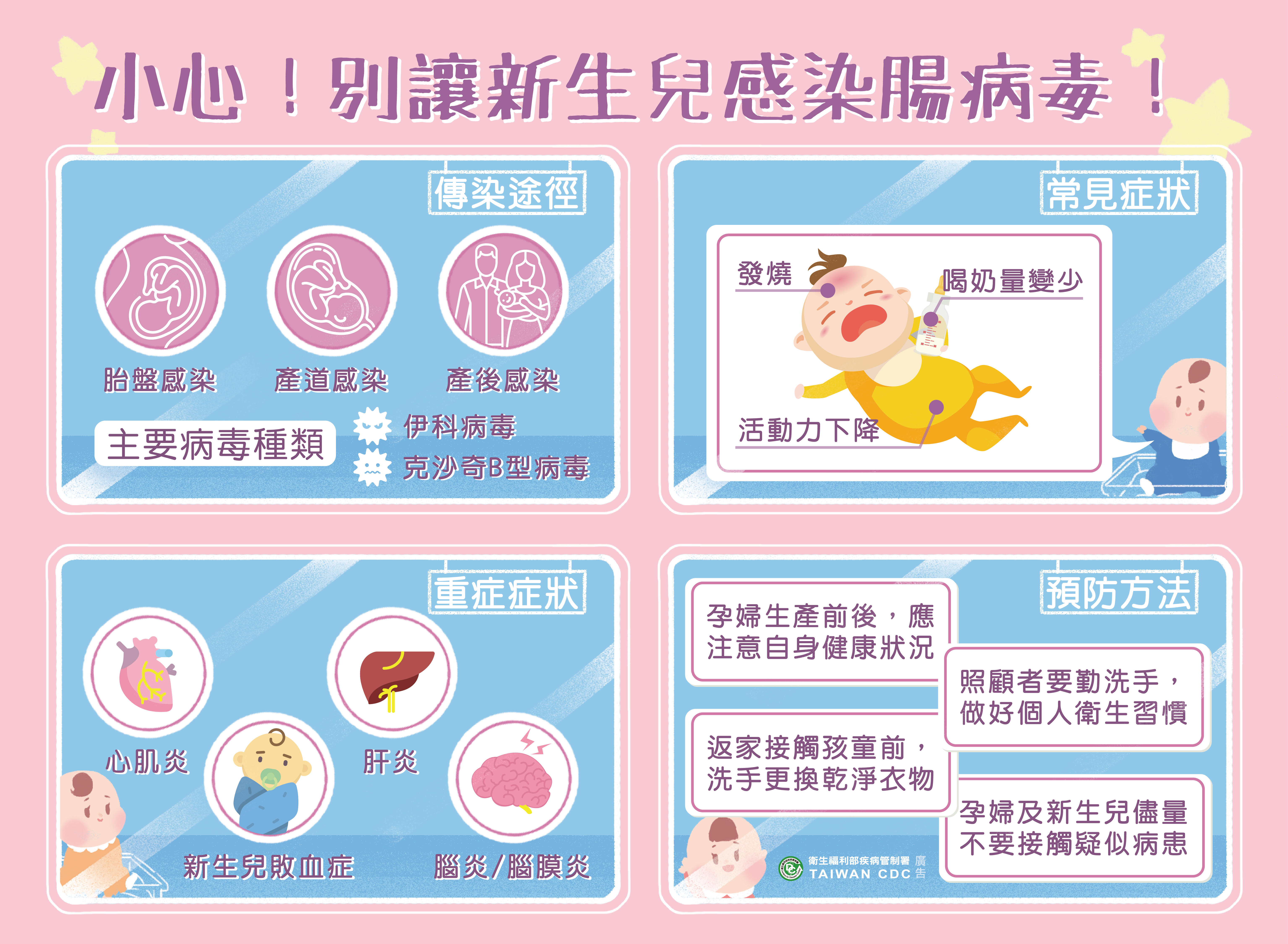 疾管署指出,新生兒可能經由孕婦分娩過程或產後人際接觸等途徑感染腸病毒,常見好發於新生兒的腸病毒為伊科病毒及克沙奇病毒。新生兒感染初期會有發燒、活力不佳、食慾降低等情形,並容易引發心肌炎、肝炎、腦炎、血小板下降、多發性器官衰竭等重症徵狀,因此提醒照顧者一旦發現新生兒出現上述初期症狀,應儘速帶至醫院及時接受治療。