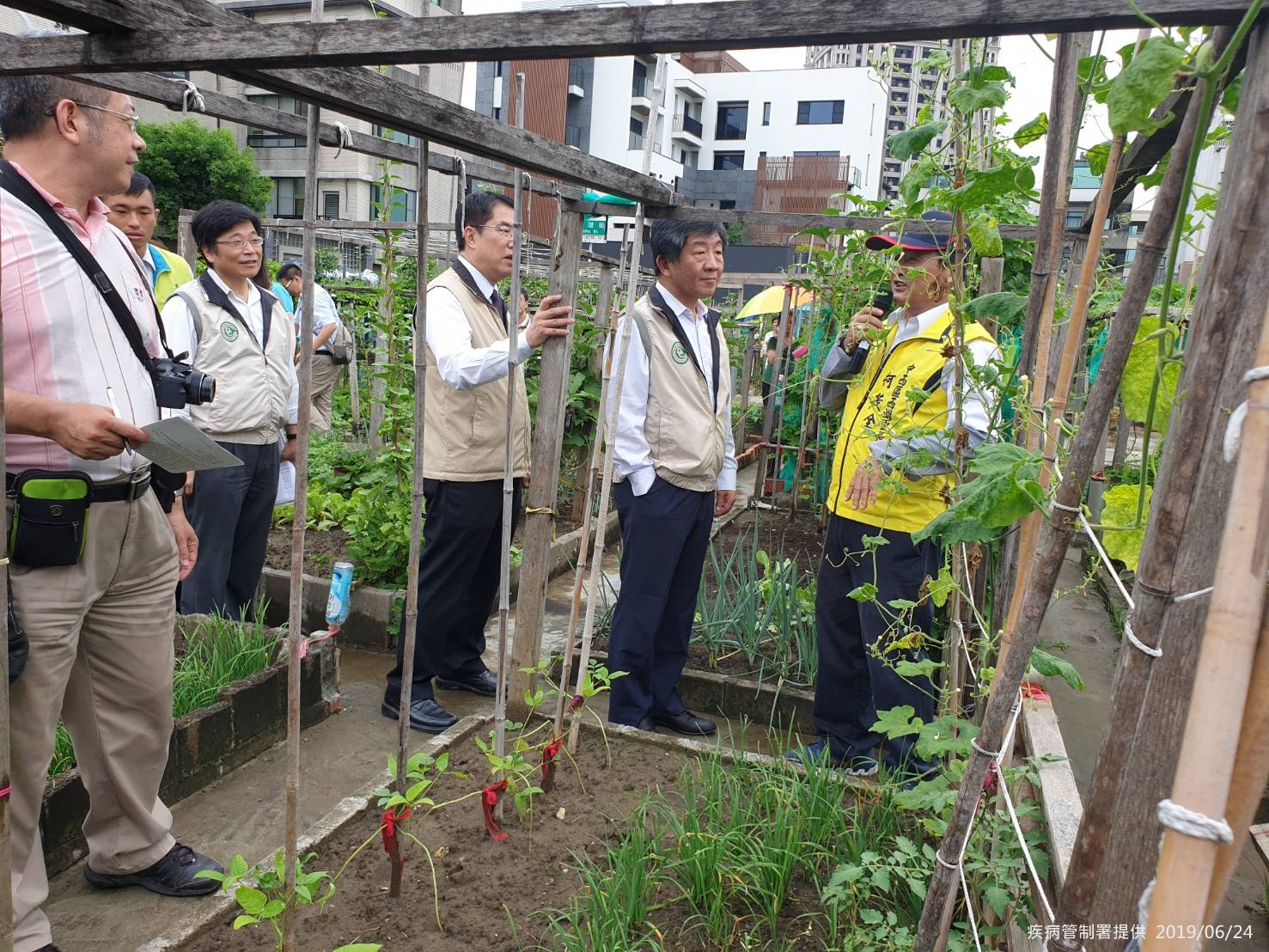 衛生福利部陳時中部長繼上週五(6月21日)出席疾病管制署於台北市舉辦的第一場高風險農園登革熱防治示範觀摩後,今(24)日馬不停蹄南下至台南市中西區出席第二場示範觀摩,與台南市政府黃偉哲市長一同參訪當地優良農園,並呼籲民眾做好儲水容器的清理與存放,防範病媒蚊孳生。