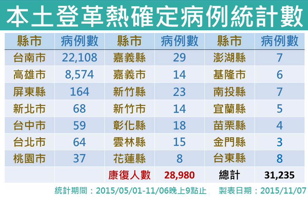 這波疫情自入夏以來,全國本土病例已達31,235例,其中台南市佔22,108例、高雄市佔8,574例、屏東縣佔164例,其餘縣市均為移入之散發疫情。昨日新增3例疑似登革熱死亡個案,目前累計死亡人數141人(台南市110例、高雄市29例、屏東縣2例),28例疑似死亡病例待審(高雄市20例、台南市7例、屏東縣1例),全國仍有23人於加護病房治療中。這波疫情已有28,980名確診病患康復,康復率達92.8%。