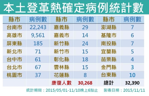 入夏以來全國本土病例已達32,390例,其中台南市佔22,243例、高雄市佔9,561例、屏東縣佔185例,其餘縣市均為移入之散發疫情。高雄市仍處高峰期,防疫工作持續進行,今日並將進行每週一天的登革熱防治日,將動員全市35區里鄰長、志工進行孳生源清除活動;台南市疫情已獲控制,全力保全防疫成果。