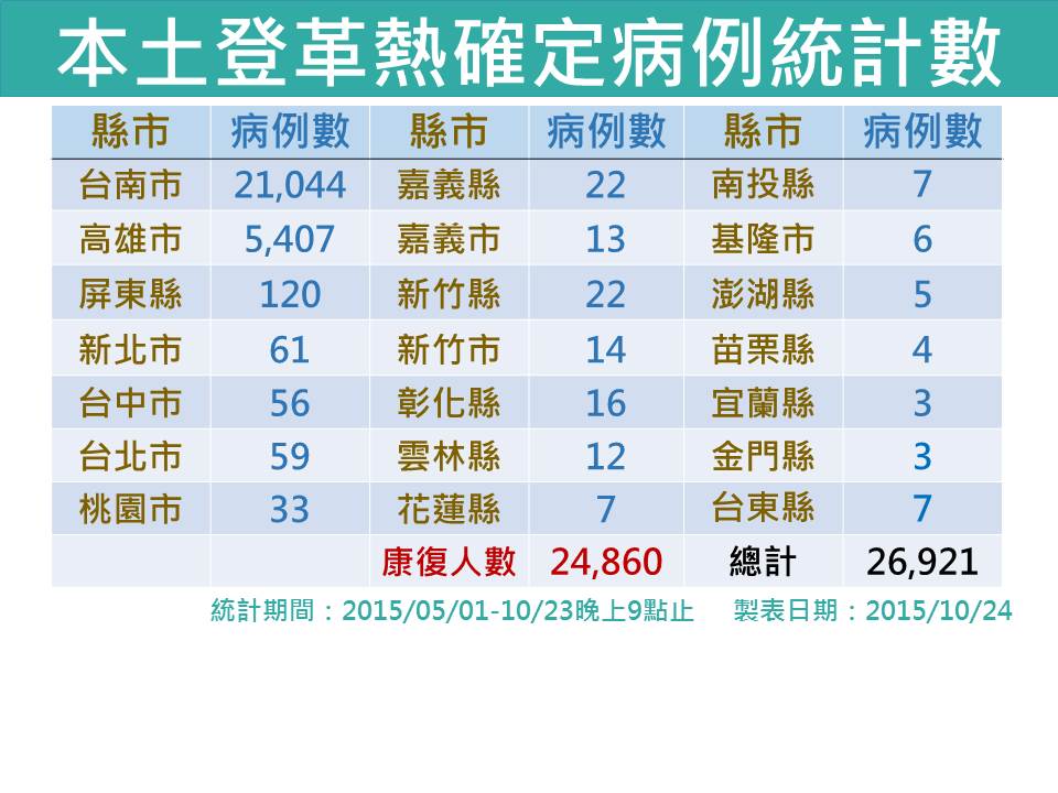 中央流行疫情指揮中心統計,昨日(10月23日)高雄市新增150例本土登革熱病例,較上週同日減少23例;台南市昨日新增102例,較上週同日減少81例。總計全國昨日新增261例本土登革熱病例。