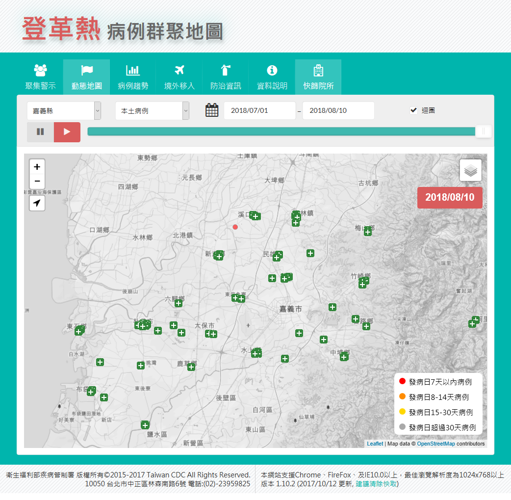 因應近年登革熱疫情威脅,疾管署自2015年起釋出登革熱病例群聚地圖(https://cdcdengue.azurewebsites.net/denguecluster.aspx),民眾可查詢本土登革熱病例地理分布,精確掌握住家附近疫情,同時里長也能運用於清除孳生源,強化社區動員;此外,群聚地圖同時提供登革熱NS1快篩院所,民眾如有疑似症狀,可查詢院所資訊後就近就醫。另為落實疫情資訊公開及提早預防,疾管署於2016年底完成「資料開放平台」(https://data.cdc.gov.tw/),目前已開放包含登革熱等230多項資料集,每日自動化更新,完全公開免費,提供地方政府及民間利用。各界如有研究或加值應用上的需求,例如開發手機APP即時通,歡迎自行下載使用資料,與政府一同攜手防疫。