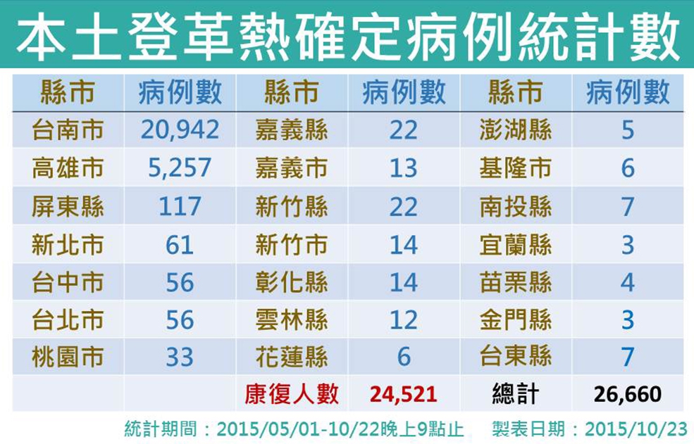 指揮中心統計,昨日高雄市新增185例本土登革熱病例,較上週同日增加35例;臺南市昨日新增119例,較上週同日減少52例。全國昨日共新增307例本土登革熱病例。自入夏以來,全國本土病例達26,660例,臺南市佔20,942例、高雄市佔5,257例、屏東縣佔117例,其餘縣市均為移入之散發疫情,其中24,521人已康復(康復率92.0%)。總計目前累計死亡人數為122人,19例疑似死亡病例待審(臺南12例、高雄市7例)。