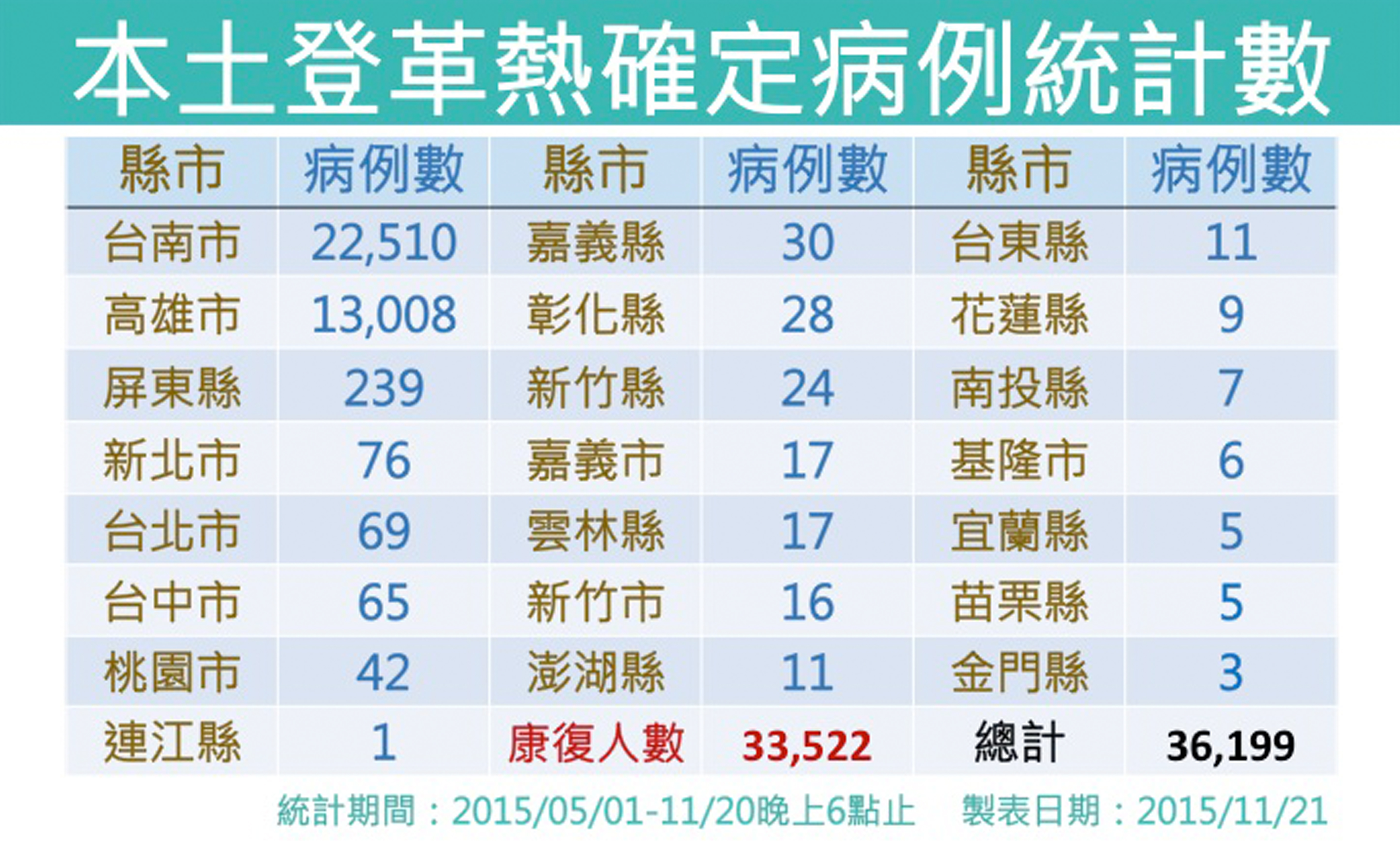 自入夏以來,全國本土病例已達36,199例,其中台南市佔22,510例、高雄市佔13,008例、屏東縣佔239例,其餘縣市均為移入之散發疫情。昨日新增2例疑似登革熱死亡個案,總計目前累計死亡人數為158人(台南市112例、高雄市44例、屏東縣2例),32例疑似死亡病例待審(高雄市30例、台南市2例),全國仍有53人於加護病房治療。但已有33,522名確診病患康復,康復率92.6%。
