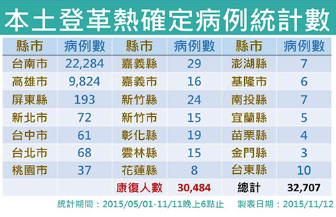 自入夏以來全國本土病例累積32,707例,台南市佔22,284例、高雄市佔9,824例、屏東縣佔193例,其餘縣市均為移入之散發疫情。昨日新增1例疑似登革熱死亡個案,目前累計死亡人數150人(台南市111例、高雄市37例、屏東縣2例),24例疑似死亡病例待審(高雄市17例、台南市6例、屏東縣1例),全國仍有39人於加護病房治療。這波疫情已有30,484名確診病患康復,康復率93.2%。