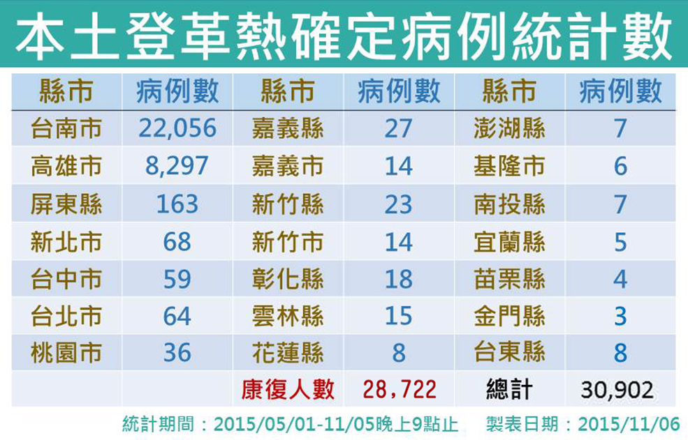 這波疫情自入夏以來,全國本土病例已達30,902例,其中台南市佔22,056例、高雄市佔8,297例、屏東縣佔163例,其餘縣市均為移入之散發疫情。昨日新增3例疑似登革熱死亡個案,目前累計死亡人數141人(台南市110例、高雄市29例、屏東縣2例),25例疑似死亡病例待審(高雄市17例、台南市7例、屏東縣1例),全國仍有20人於加護病房治療中。這波疫情已有28,722名確診病患康復,康復率達92.9%。