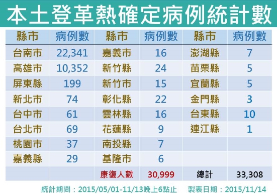 自入夏以來全國本土病例累積33,308例,台南市佔22,341例、高雄市佔10,352例、屏東縣佔199例,其餘縣市均為移入之散發疫情。昨日新增3例疑似登革熱死亡個案,目前累計死亡人數150人(台南市111例、高雄市37例、屏東縣2例),31例疑似死亡病例待審(高雄市24例、台南市6例、屏東縣1例),全國仍有34人於加護病房治療。這波疫情已有30,999名確診病患康復,康復率93.1%。