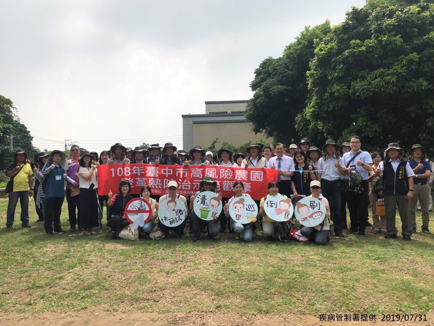 為強化各縣市政府對於菜(果)園、農場管理之查核量能,衛生福利部何啟功次長於今(31)日出席疾病管制署於臺中市南屯區舉辦的第三場「108年高風險農園登革熱防治示範觀摩」,與臺中市陳子敬副市長及各地方政府防疫人員共同觀摩優良農園,期以農園分享之管理經驗做為防疫人員執行防治工作的參考,並進一步呼籲民眾落實儲水容器的清理與存放,防範病媒蚊孳生。