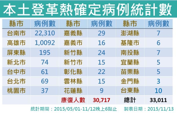 自入夏以來全國本土病例累積33,011例,台南市佔22,310例、高雄市佔10,092例、屏東縣佔195例,其餘縣市均為移入之散發疫情。昨日新增4例疑似登革熱死亡個案,目前累計死亡人數150人(台南市111例、高雄市37例、屏東縣2例),28例疑似死亡病例待審(高雄市21例、台南市6例、屏東縣1例),全國仍有34人於加護病房治療。這波疫情已有30,717名確診病患康復,康復率93.1%。