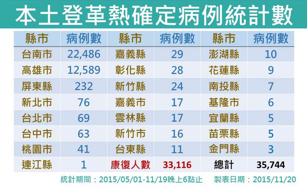 高雄市昨日(11月19日)新增364例本土登革熱病例,較上週同日增加96例;台南市昨日新增25例,較上週同日減少1例。全國昨日共新增399例本土病例。入夏以來全國本土病例達35,744例,台南市佔22,486例、高雄市佔12,589例、屏東縣佔232例。全國累積死亡158人(台南市112例、高雄市44例、屏東縣2例),仍有30例疑似死亡病例待審(高雄市28例、台南市2例)。全國仍有60人於加護病房治療,但已有33,116名確診病患康復,康復率92.6%。