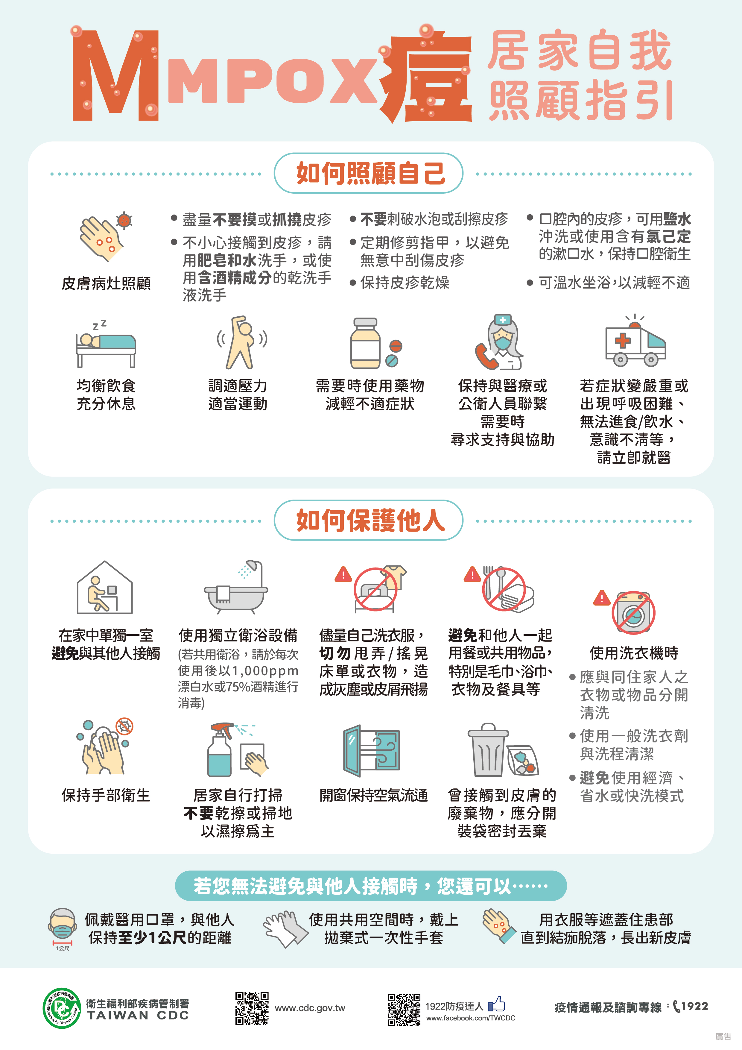 - 5. 確診者請勿與動物密切接觸,以避免病毒傳播,如家中有飼養寵物(靈長類、囓齒類及兔子),相關檢驗及照護指引請參閱農業部動植物防疫檢疫署訂定「M痘確診者飼養之動物(靈長類、囓齒類及兔子)檢驗及照護指引」(網址:https://gov.tw/Vgq)。