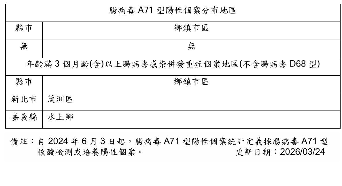 檢出腸病毒A71型陽性個案分布或年齡滿3個月齡(含)以上腸病毒感染併發重症個案地區(不含腸病毒D68型)-20260324.jpg